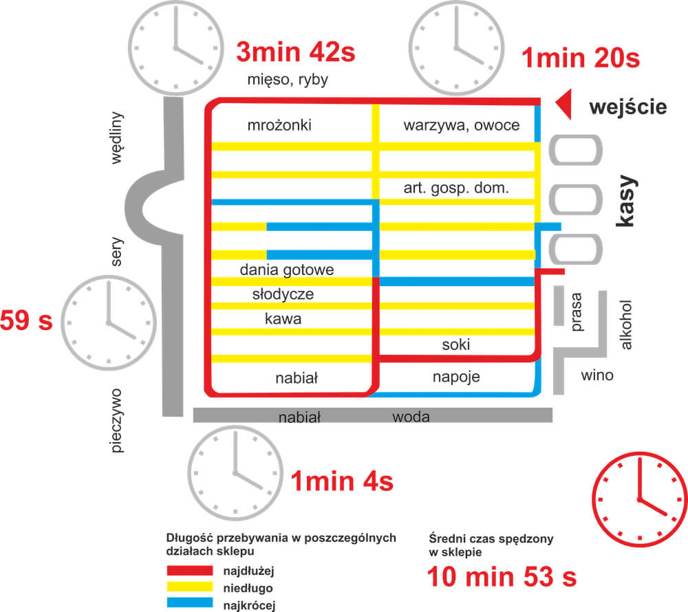 Dodatkowo osoby robiące zakupy, deklarują w ankietach zwiedzenie niemal całego sklepu, ale zaledwie 2% klientów przechodzi przez trzy czwarte całej jego powierzchni.